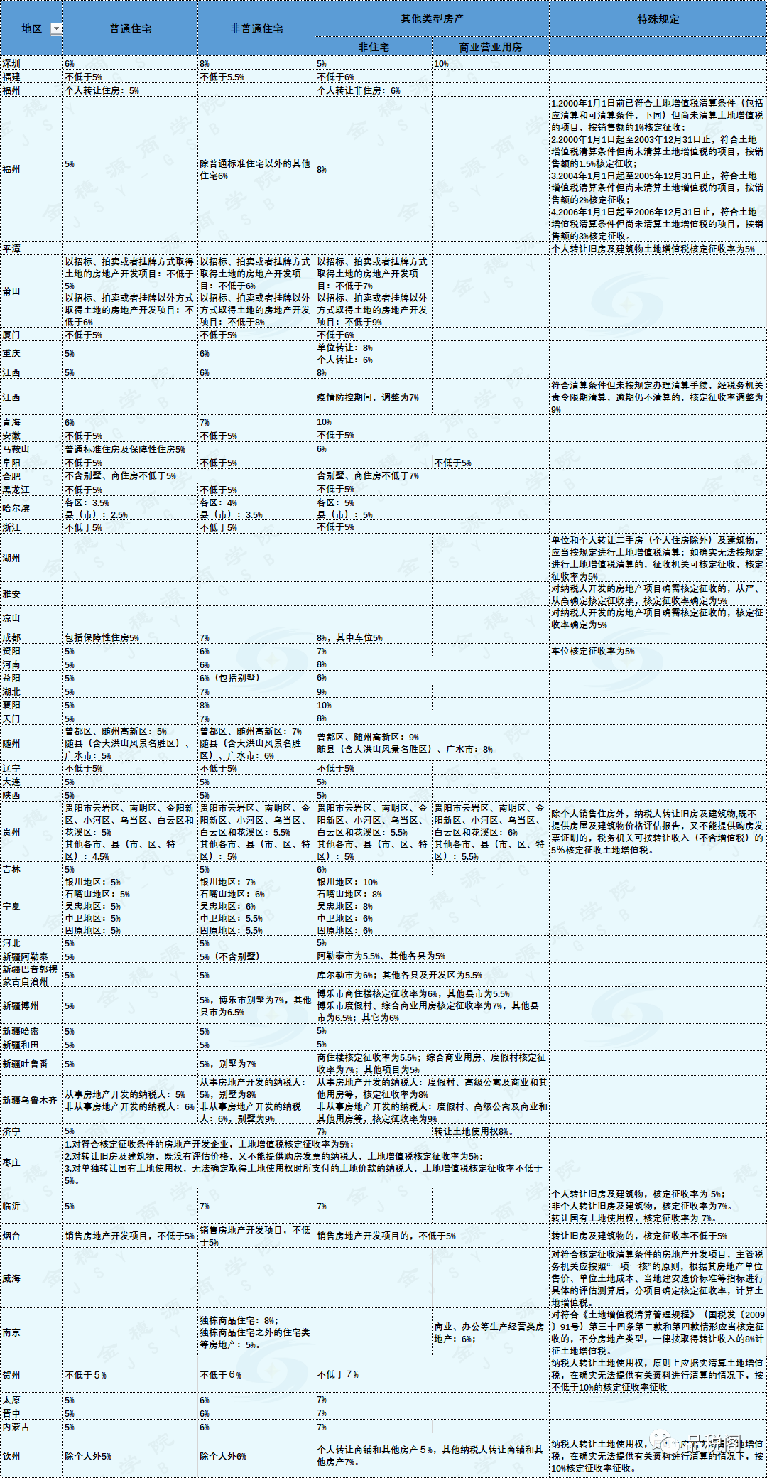 土地增值税核定征收率,按普通住房、非普通住房及其他类型房地产三种划分,曾都区、随州高新区分别为5%、7%、9%;随县(含大洪山风景名胜区)、广水市分别为5%、6%、8%。