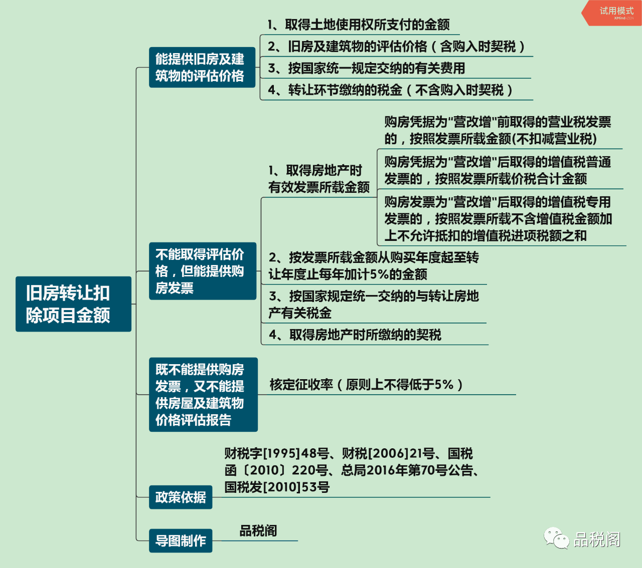 1、财税字[1995]48号第十条规定, 转让旧房的,应按房屋及建筑物的评估价格、取得土地使用权所支付的地价款和按国家统一规定交纳的有关费用以及在转让环节缴纳的税金作为扣除项目金额计征土地增值税。对取得土地使用权时未支付地价款或不能提供已支付的地价款凭据的,不允许扣除取得土地使用权所支付的金额。
