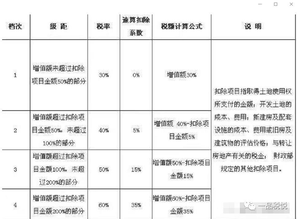 譬如一个商品住宅项目,销售收入为10亿元,允许扣除额为6亿元,则其增值额为10亿元-6亿元=4亿元,增值率为(10亿-6亿)/6亿*100%=66.67%,适用于第二等级“增值额超过扣除项目金额50%、未超过扣除项目金额100%的部分”,适用税率为40%,速算扣除率为5%。