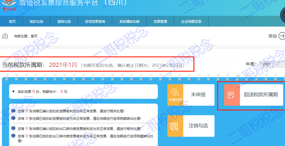 2、然后我登录勾选平台,这个时候你发现,所属期还是在1月,还没有回退到12月,但是页面右边已经出现了一个回退税款所属期的按钮。