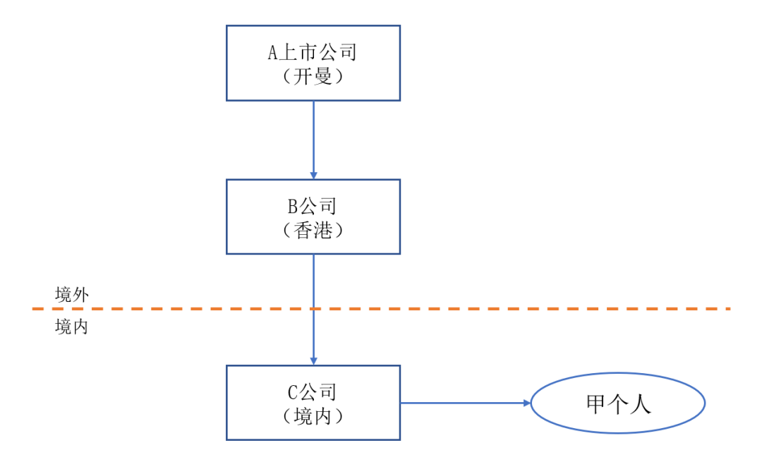 其实,对于在我国在境外上市的公司,除了H股直接香港上市的以外,大部分都是以红筹构架在香港、美国上市的。这些企业中互联网公司特别多,且互联网公司股权激励也非常普遍。我们以如下简单构架为例: