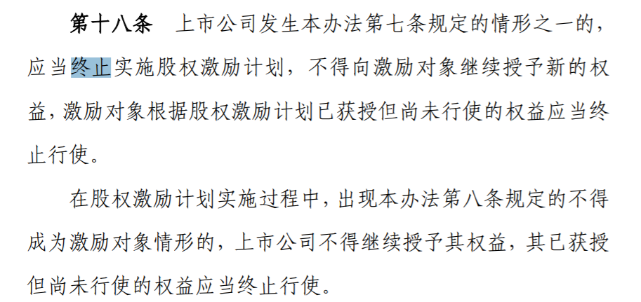 根据《上市公司股权激励管理办法》(中国证券监督管理委员会令第148号修改)第十八条,当上市公司发生该办法第七条规定的情形之一的, 应当终止实施股权激励计划,不得向激励对象继续授予新的权益,激励对象根据股权激励计划已获授但尚未行使的权益应当终止行使。