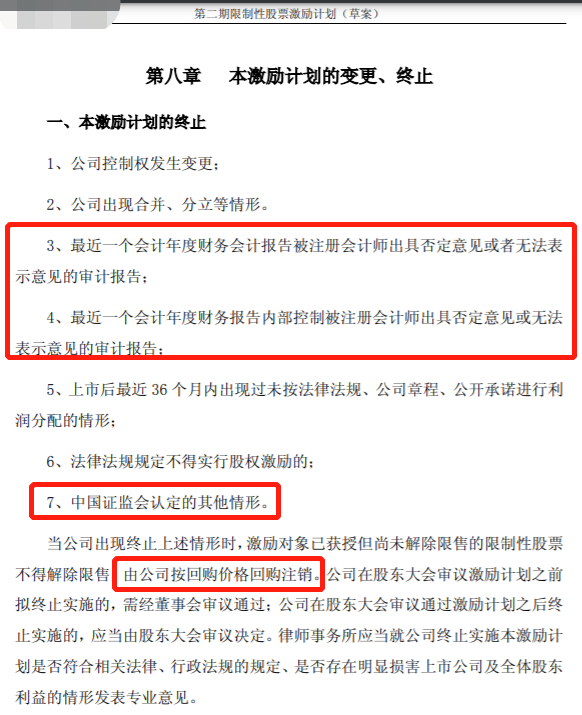那么问题来了,因为根据该公司当初的股权激励方案,“出现了最近一个会计年度财务会计报告被注册会计师出具否定意见或者无法表示意见的审计报告;最近一个会计年度财务报告内部控制被注册会计师出具否定意见或无法表示意见的审计报告”,该公司应该终止激励计划,激励对象已获授但尚未解除限售的限制性股票不得解除限售,由公司按回购价格回购注销。