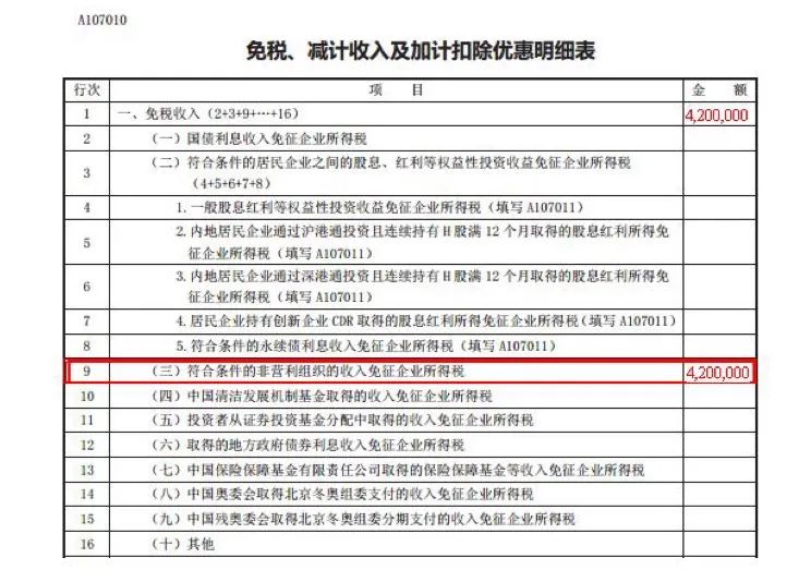 案例中取得的接受捐赠收入400万元和政府补助收入20万元符合免税收入条件,因此在填写A107010《免税、减计收入及加计扣除优惠明细表》第6行“符合条件的非营利组织的收入免征企业所得税”栏次时应填写420万元。
