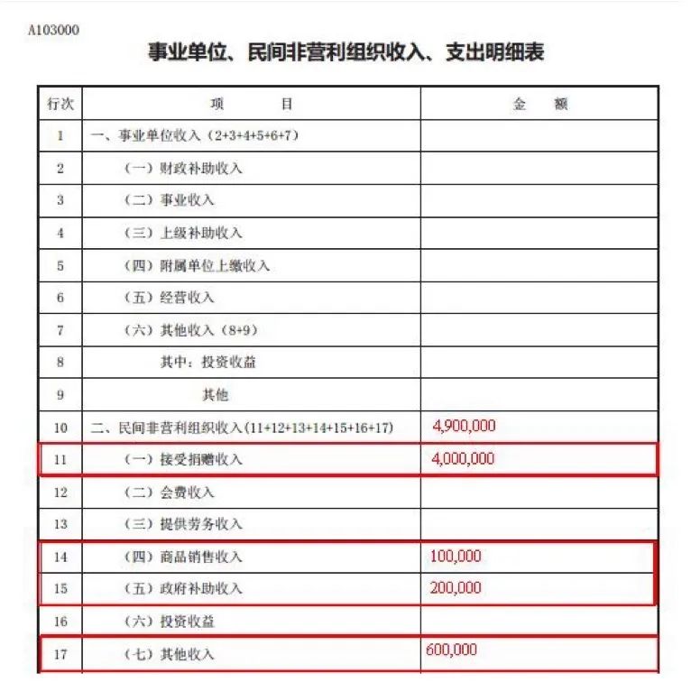 案例中取得的所有收入应分别填写A103000《事业单位、民间非营利组织收入、支出明细表》的第11行“接受捐赠收入”400万元,第14行“商品销售收入”10万元,第15行“政府补助收入”20万元和第17行“其他收入”60万元。