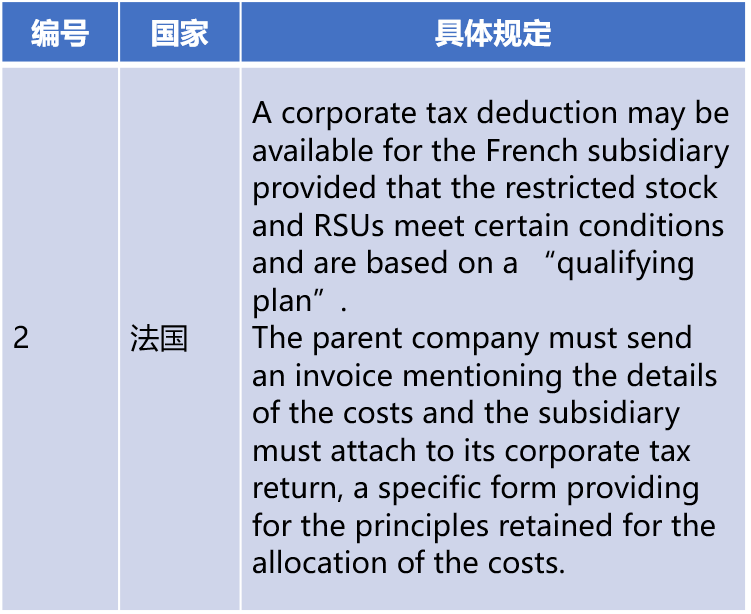 考虑到激励对象会在行权等待期内在集团内不同子公司之间调动。因此,在实际行权的当年企业所得税扣除时,法国会要求母公司向相关子公司寄送一个发票或者说分割单,这里要详细地说明股权激励费用的分摊方法。各个子公司各自企业所得税年度申报扣除时,要将母公司的这个股权激励费用分割单作为附件。