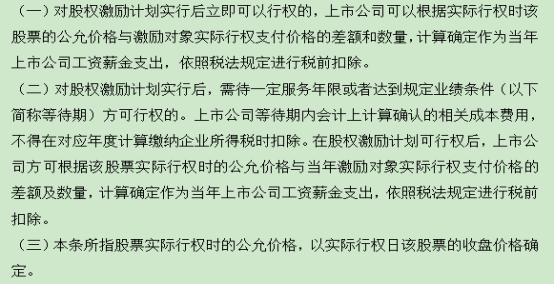 根据国家税务总局公告2012年第18号第二条规定:上市公司依照《管理办法》要求建立职工股权激励计划,并按我国企业会计准则的有关规定,在股权激励计划授予激励对象时,按照该股票的公允价格及数量,计算确定作为上市公司相关年度的成本或费用,作为换取激励对象提供服务的对价。上述企业建立的职工股权激励计划,其企业所得税的处理,按以下规定执行: