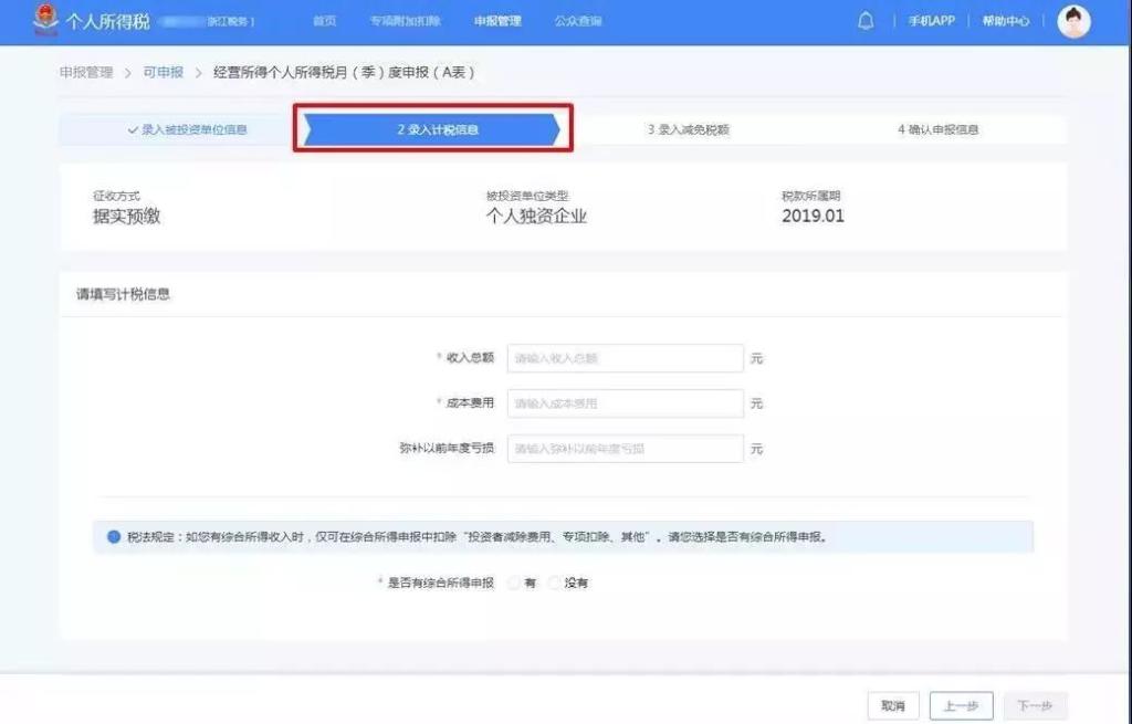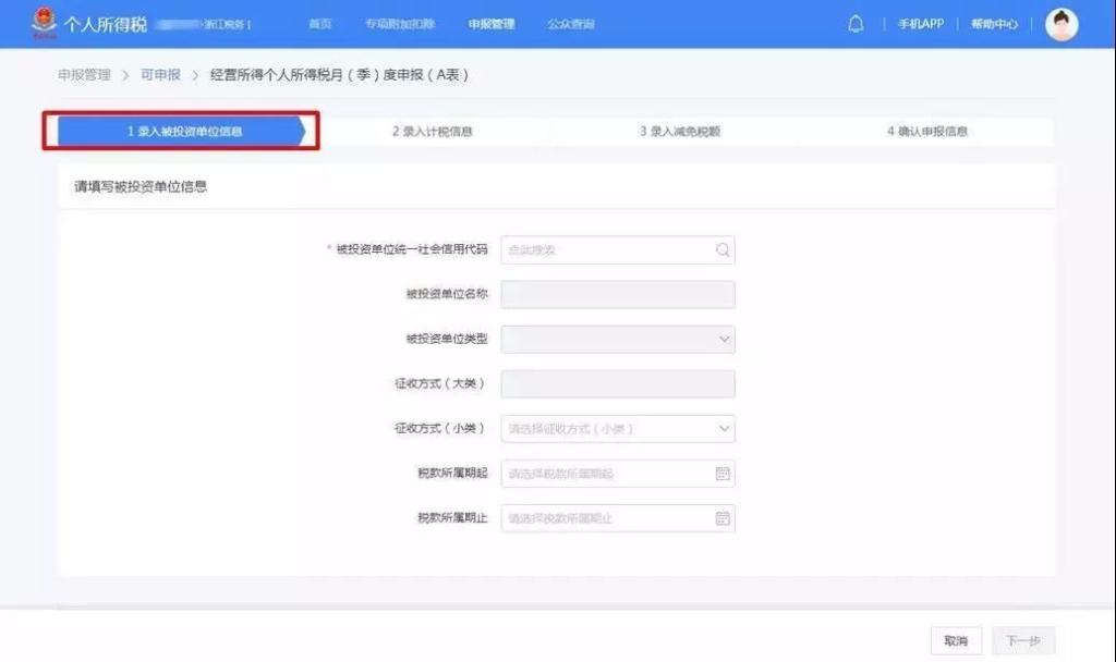 点击【经营所得个人所得税月(季)度申报】(A表),选择对应需要申报的年份,录入被投资单位统一社会信用代码,相关信息自动带出:
