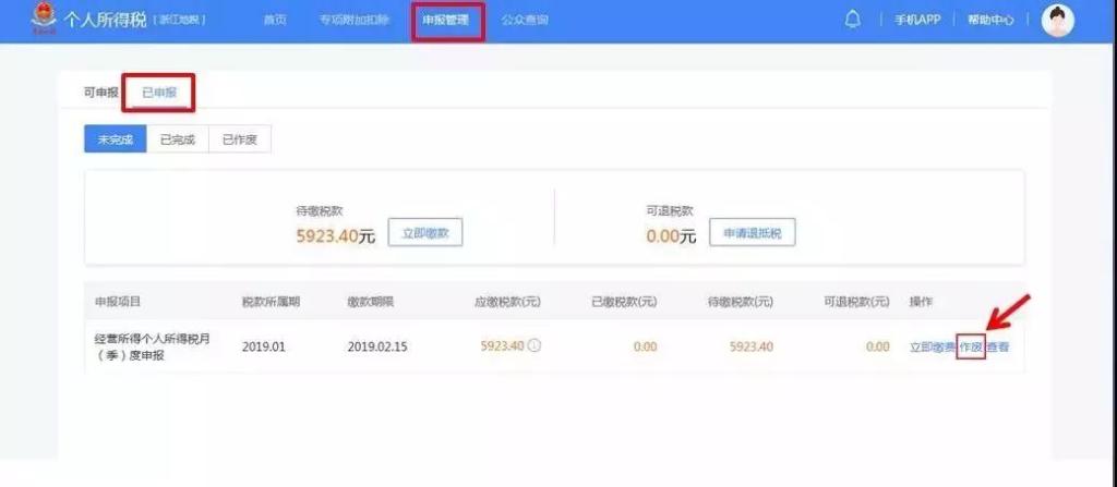 用于已申报成功发现有误的报表可进行作废,发生已开票或发生抵缴业务时,则无法作废。