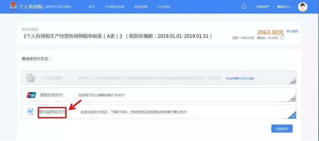 2.支付方式选择【银行端凭证支付】,点击【立即支付】: