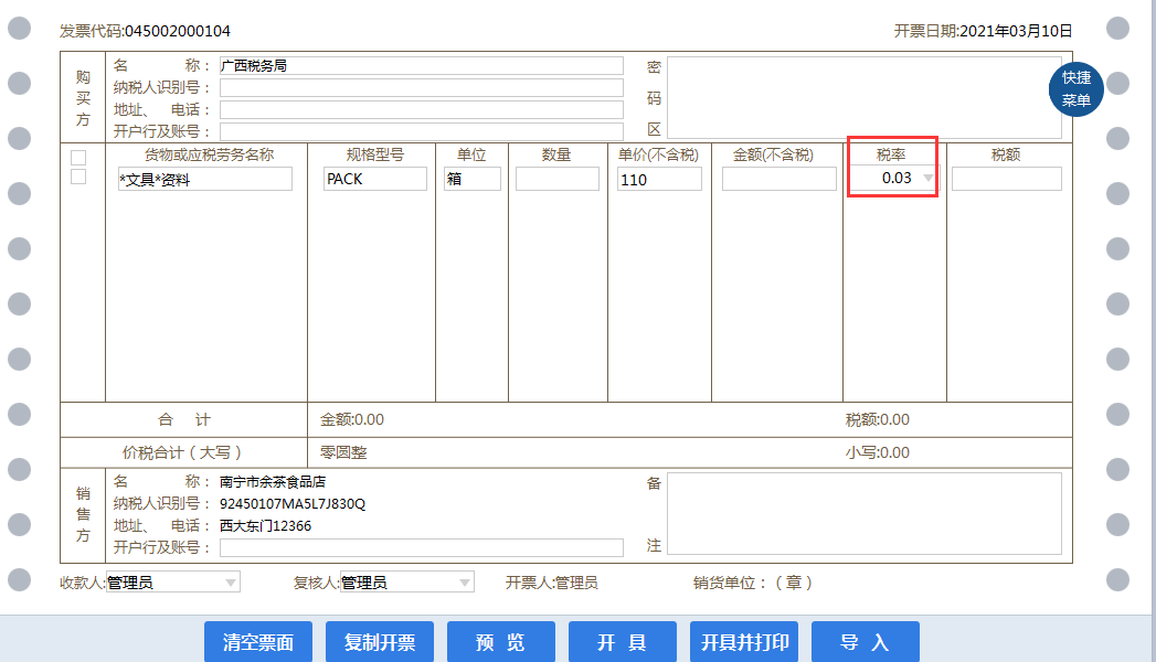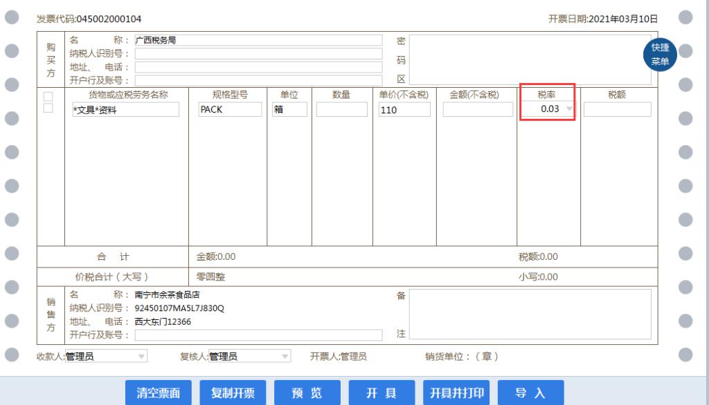 第二步:双击选择或手工录入购买方信息、商品信息,税率栏次选择对应的征收率(3%或5%)即可,点击【确定】。
