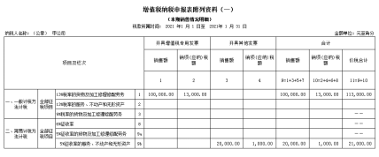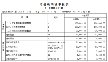 举例:甲公司是一般纳税人, 2021年1月,甲公司一般计税方法下销售货物10万元,销项税额1.3万元,本期进项税额2万元,期初无留抵税额。另外,出租其2010年10月1日取得的厂房,月租金2.1万元(含税价),对该部分收入甲公司选择简易计税方式。
