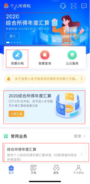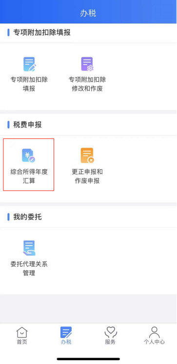 手机登录个人所得税APP后,点击首页【2020综合所得年度汇算】专题页—【开始申报】或【办税】—【税费申报】—【综合所得年度汇算】进入简易申报界面。