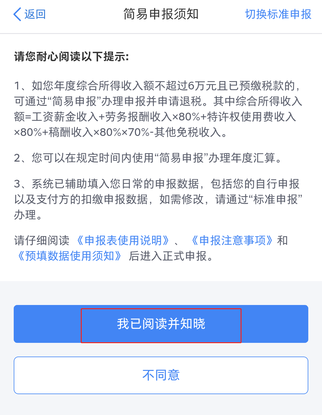 ①进入汇算页面后,阅读“简易申报须知”,点击【我已阅读并知晓】,系统自动判定进入简易申报模式;