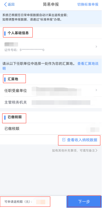 ②核对个人基础信息,选择汇算地,点击“查看收入纳税数据”确认收入数据无误,核实“已缴税额”,确认“可申请退税额(元)”;
