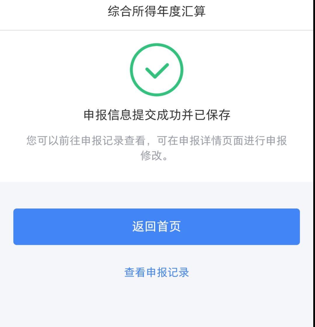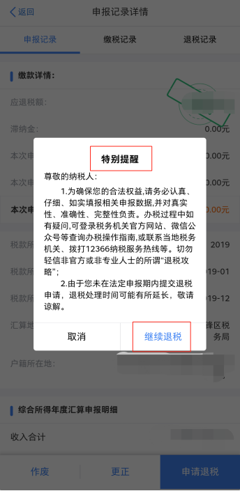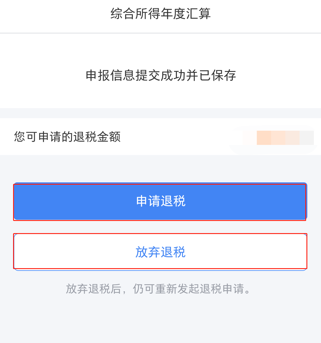 ④申报完成后,如您存在可退税金额的,点击“申请退税”按钮即可发起退税申请,点击“申请退税”后,系统会弹出特别提醒,阅读后点击“继续退税”,选择或添加需要接收退税的银行卡,点击“提交”并“确定”;如您选择放弃退税的,点击“放弃退税”即可。