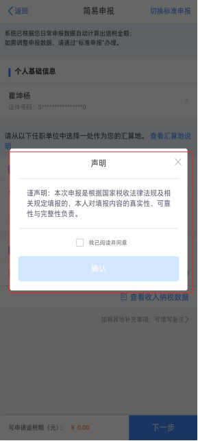 ③点击【下一步】,阅读声明,选择【我已阅读并同意】点击【确认】,完成申报流程。
