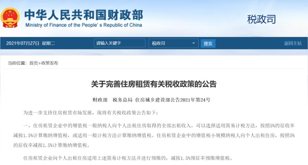 2021年7月26日,财政部、税务总局住房城乡建设部三部门联合发布《关于完善住房租赁有关税收政策的公告》(财政部、税务总局、住房城乡建设部公告2021年第24号,以下简称“24号公告”),全面落实2021年6月18日国务院常务会议精神。