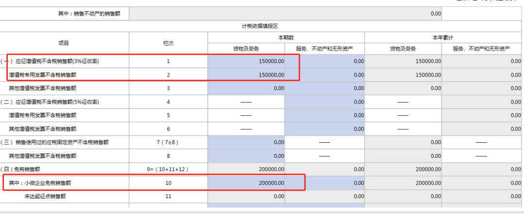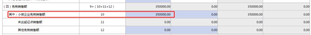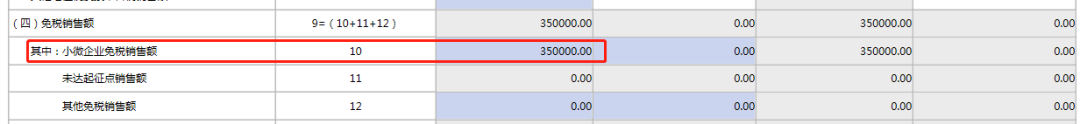 对于个体工商户,第10行小微企业免税销售额是灰化的,无法填写。在相同业务情况下,企业填入第10行的数据,个体户只能填入第11行未达起征点销售额哦!