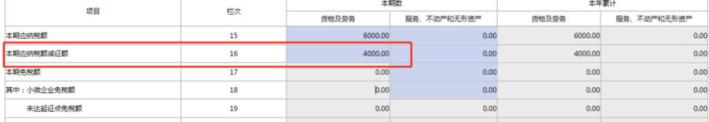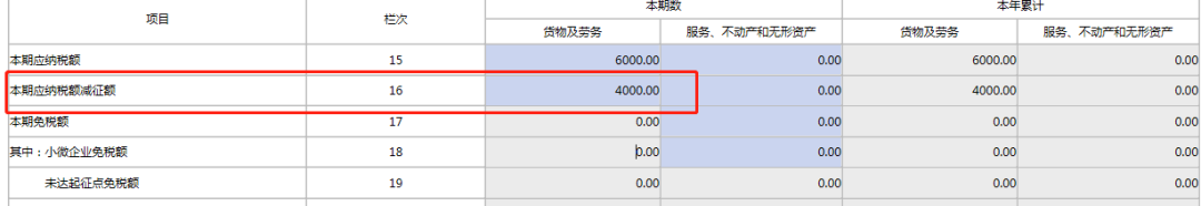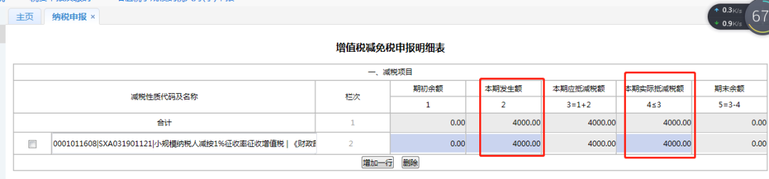 减免税申报表:本期发生额和本期实际抵减税额填写4000(200000*2%)