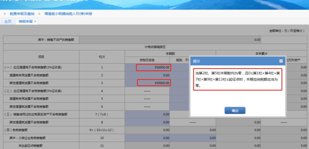 甲企业是增值税小规模纳税人,增值税按季度申报,二季度共开具税率为3%的增值税普通发票350000元。会计在申报二季度增值税小规模纳税人申报表时,填写好申报数据后,一直保存不了,提示的报错信息如下图,该怎么解决呢?
