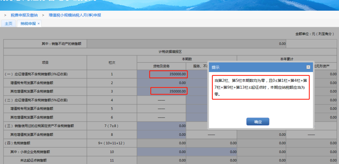所以该单位会计不能按照一季度时申报的填写方式来申报,销售额未超过45万的增值税普票部分,只需要填写第10行-小微企业免税销售额即可。该单位会计仍在报表的第一行和第三行填写,故出现上述报错。