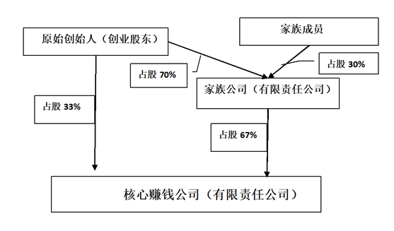 第二步:创业股东或原始创始人和第一步中注册成立的有限责任公司共同出资注册成立一家核心赚钱公司(该赚钱公司是有限责任公司)。创业股东或原始创始人占股33%、第一步中注册成立的有限责任公司占股67%