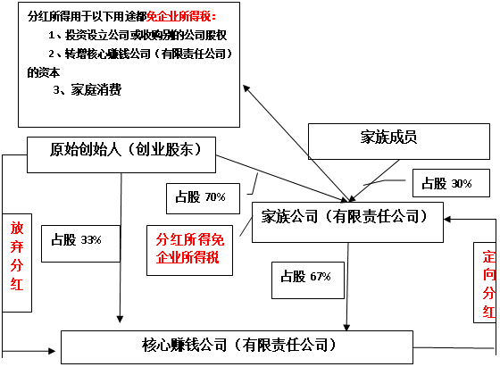 1、作为自然人的原始创始人(创业股东)放弃核心赚钱公司(有限责任公司)的分红所得,将向家族公司定向分红。