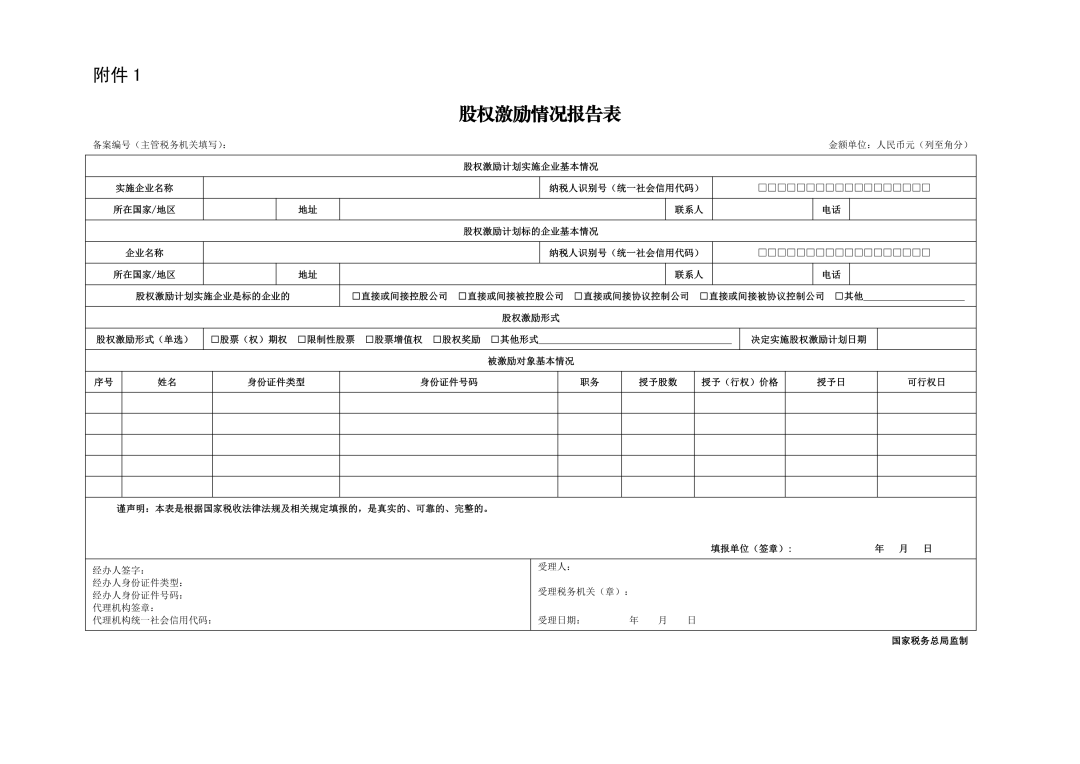 (十)加强股权激励个人所得税管理。严格执行个人所得税有关政策,实施股权(股票,下同)激励的企业应当在决定实施股权激励的次月15日内,向主管税务机关报送《股权激励情况报告表》(见附件),并按照《财政部 国家税务总局关于个人股票期权所得征收个人所得税问题的通知》(财税〔2005〕35号)、《财政部 国家税务总局关于完善股权激励和技术入股有关所得税政策的通知》(财税〔2016〕101号)等现行规定向主管税务机关报送相关资料。股权激励计划已实施但尚未执行完毕的,于2021年底前向主管税务机关补充报送《股权激励情况报告表》和相关资料。境内企业以境外企业股权为标的对员工进行股权激励的,应当按照工资、薪金所得扣缴个人所得税,并执行上述规定。