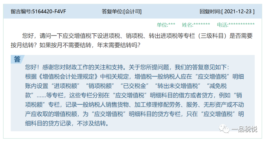 但现在是财务软件记账的情况下,在软件账套初始化自动结转的功能下,“应交税费-应交增值税”下的明细专栏期末余额会自动结转到下一年的期初余额,不进行账务处理,将造成一年年“应交税费-应交增值税”下的明细专栏的金额无限制的累加,金额越滚越大,一旦出了差错,也不容易找出错误原因,很多财务朋友就考虑是否应该月末或年末把增值税的专栏结平。但是,按上面会计司给出的规定,“应交税费-应交增值税”下的专栏期末也无需结转。