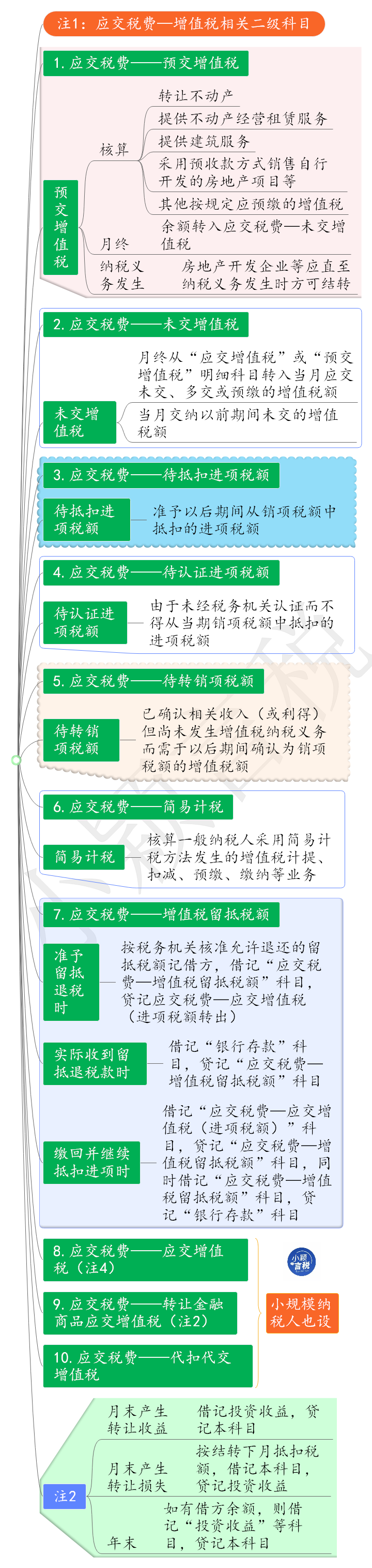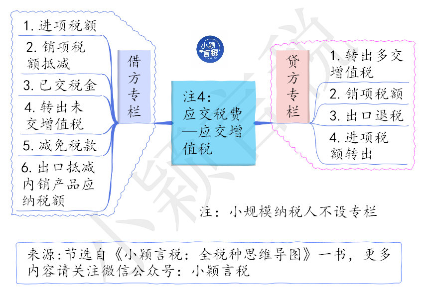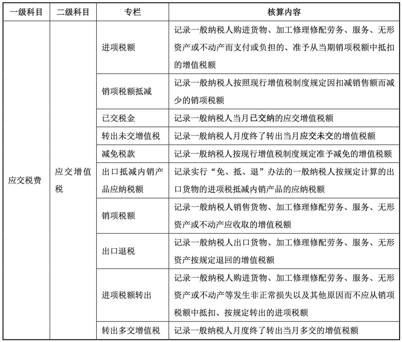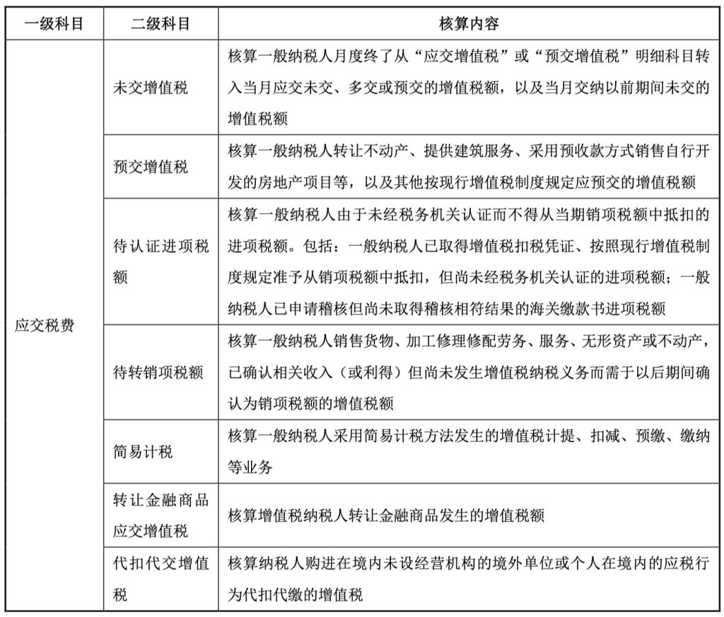 注:小规模纳税人的应纳增值税额,也通过“应交税费——应交增值税”明细科目核算,但不设置若干专栏。小规模纳税人应交税费下共设“应交税费——应交增值税”、“应交税费——转让金融商品应交增值税”、“应交税费——代扣代交增值税”三个明细科目。