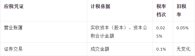 3)营业账簿印花税税率从原先按对“实收资本和资本公积合计”的万分之五降低为万分之二点五。