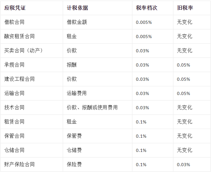 1)承揽合同、建设工程合同、运输合同印花税的税率从原先的万分之五降低为万分之三;