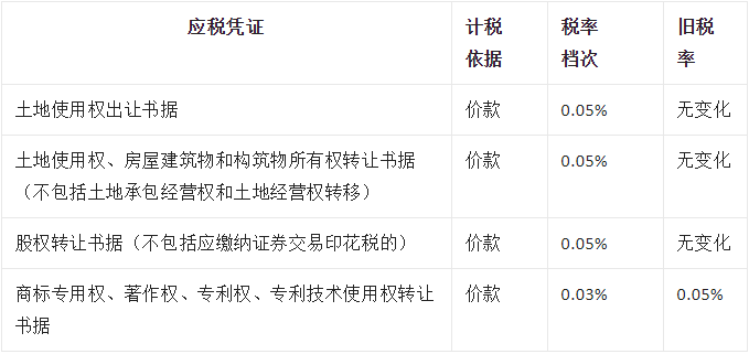 2)部分产权转移合同降低税率:商标权、著作权、专利权、专有技术使用权转让书据印花税税率从原先的万分之五降低为万分之三。