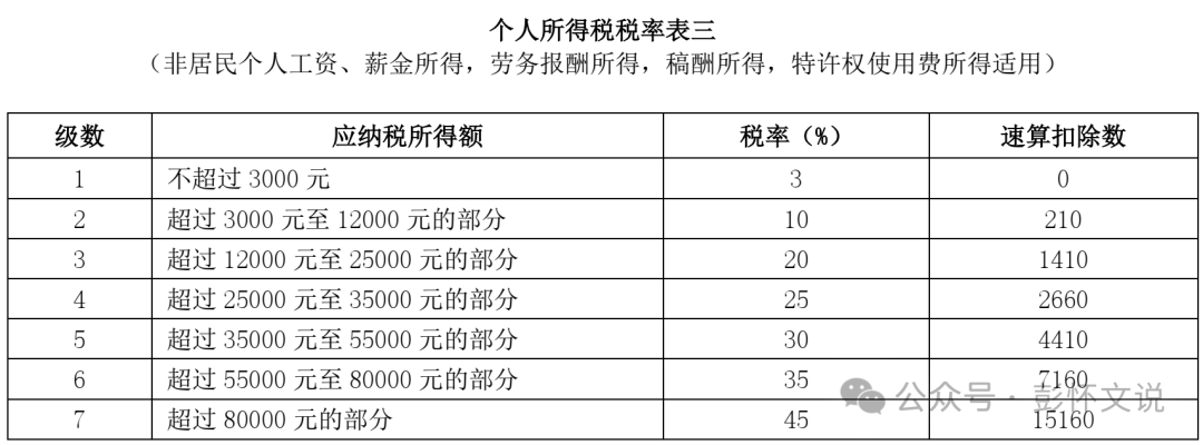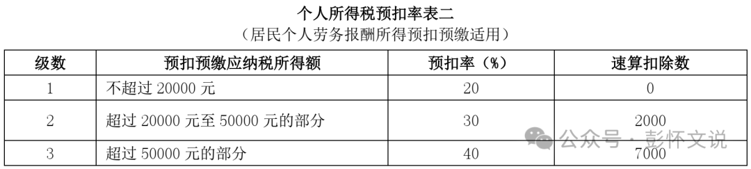 税率:适用20%至40%的超额累进预扣率(见《个人所得税预扣率表二》)。