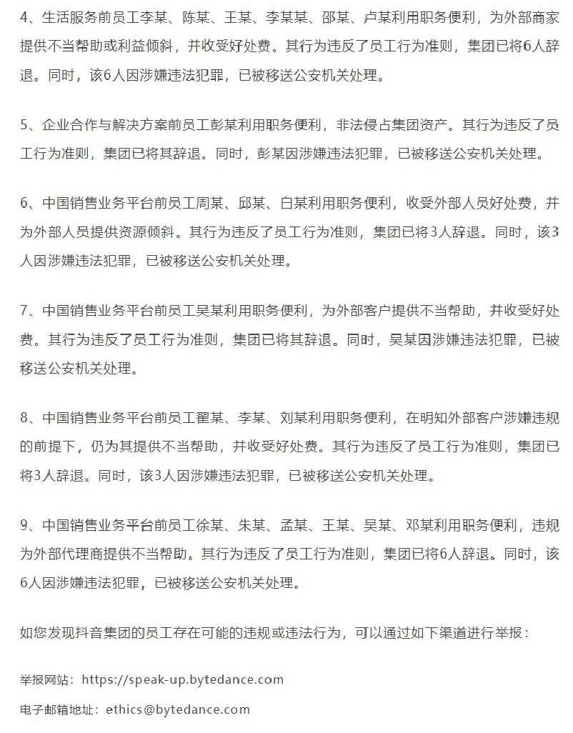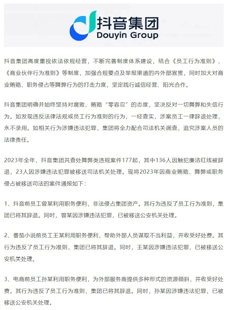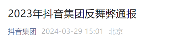 2024年3月29日,抖音集团(即字节跳动)发布了《2023年抖音集团反舞弊通报》。