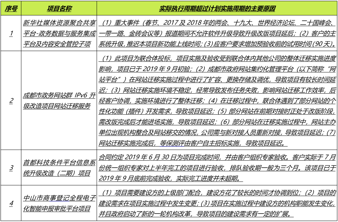(4)获取主要项目实施起始时间、预计验收时间、实际完工验收时间、计划实施周期、实际实施周期等,检查主要项目与收入确认相关的支持性文件,包括中标文件、销售合同及验收报告等,了解并核查合同履行时间;