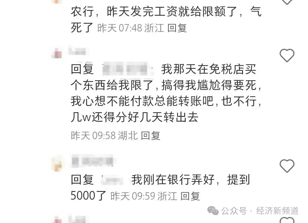 有网友称,自己用了20年的银行卡被限额5000元;有网友支付房租时发现账户非柜面支付日累计金额上限为1000元,交房租都不够;还有一些网友表示,限额成功遏制了他的消费冲动,有人称,“一想到提额还要去营业厅,就不想消费了”。