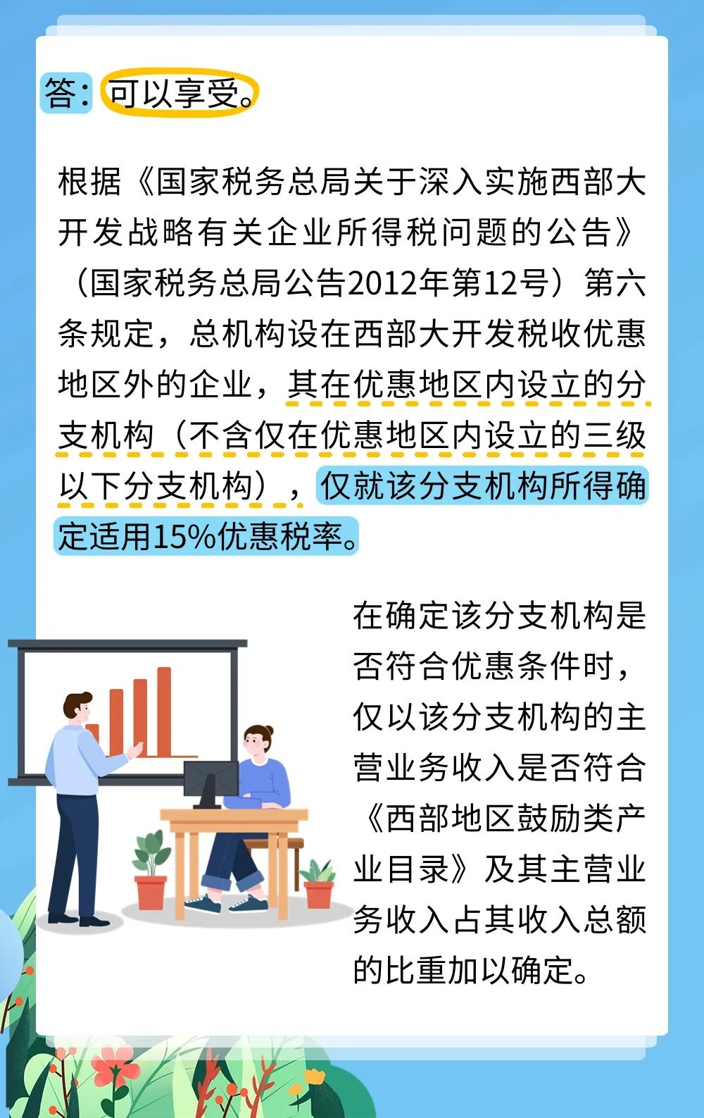 总公司设立在上海,分支机构设立在西部大开发税收优惠地区,分支机构能否单独享受西部大开发企业所得税优惠政策?