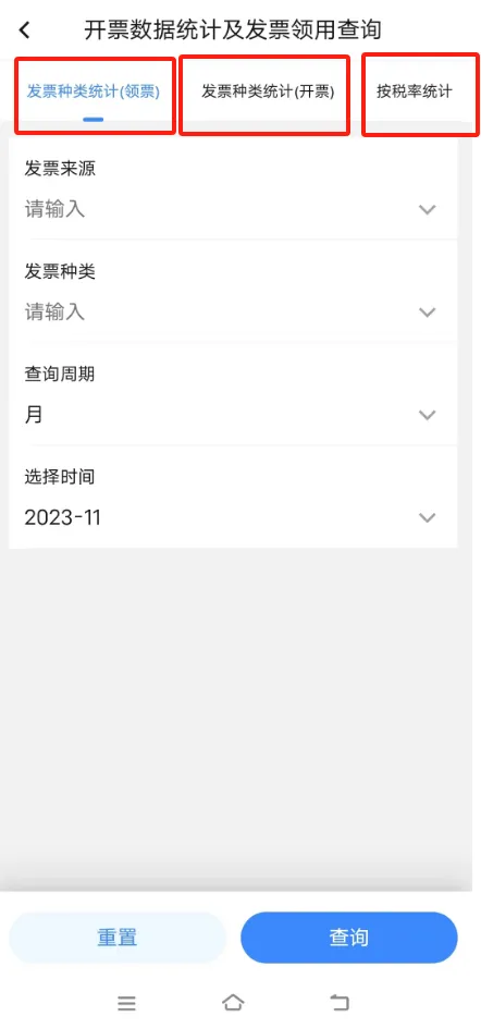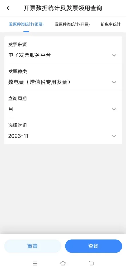 本功能在纳税人在电子发票服务平台移动端打开“开票数据统计及发票领用查询”界面后,可查询发票汇总数据。汇总数据包括按发票种类统计(领票)、按发票种类统计(开票)、按税率/征收率统计数据。
