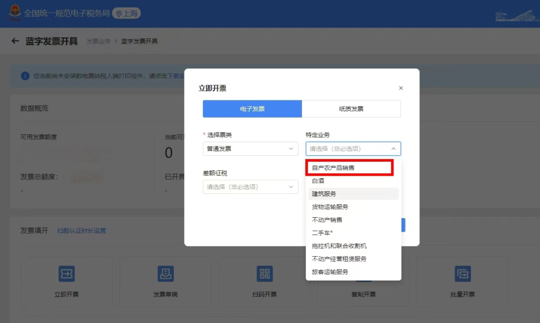 选择【发票种类】,并在【特定业务】下拉框中,选择“自产农产品销售”。