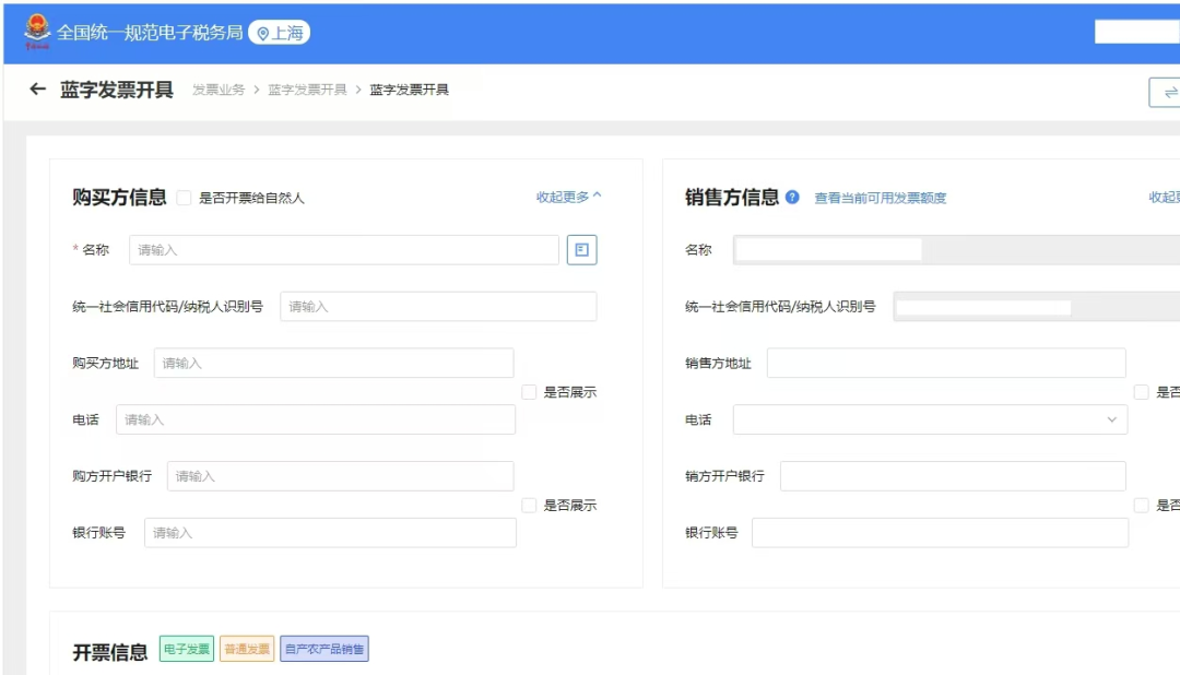 进入开票页面,在销售方信息处,填写企业名称、统一社会信用代码等信息。