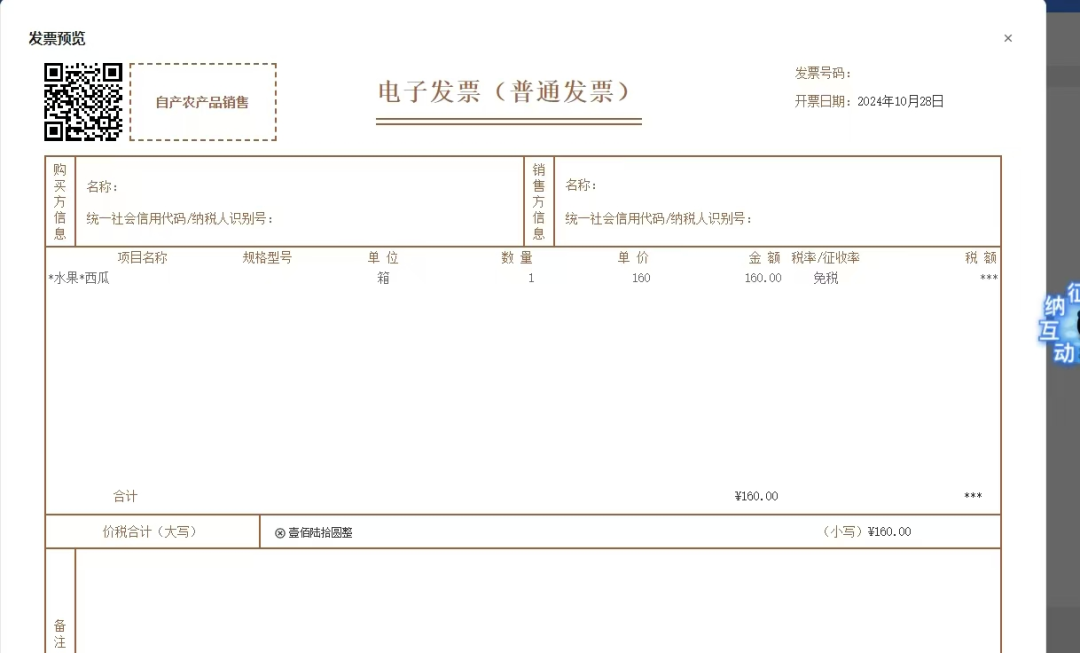 在项目名称处,输入农产品名称、单位、金额等,点击发票开具。