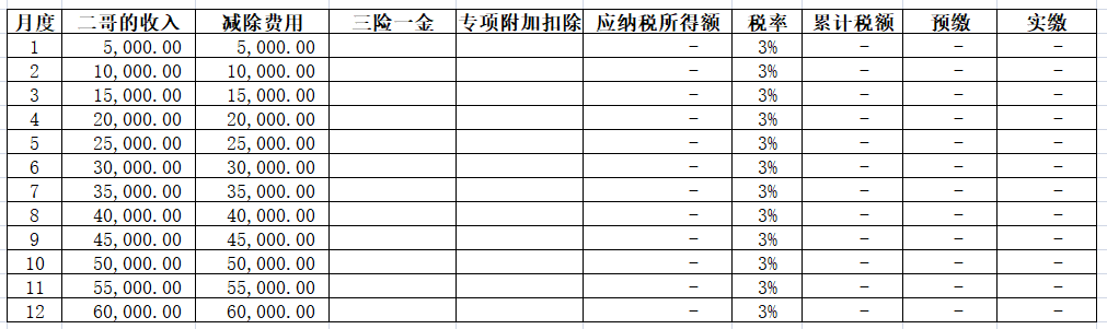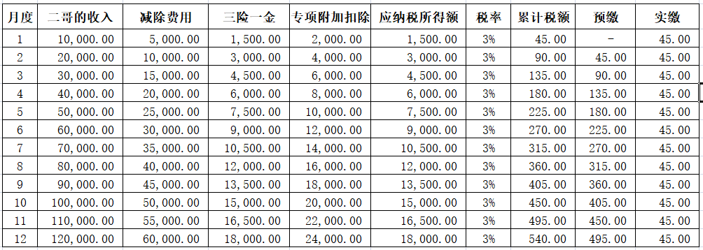 同时,二哥在B公司还有一处工资薪金所得,每个月5000元,这5000元每个月B公司申报扣缴个税,除了减除费用5000,没有任何其他扣除项目。