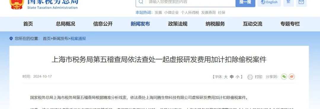 上海一家生物科技公司因2023年虚构与外部机构的委托研发合同,虚增研发费用1050万元,且未提供外包成果所有权证明及付款凭证,被追缴税款206万元,并处以罚款及滞纳金合计376万元。