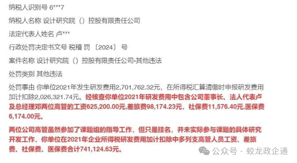 新疆一家设计研究院公司因将未实际参与研发的董事长、法人代表等的工资、差旅费等计入研发费用,导致少缴企业所得税138,960.87元,被定性为偷税,并处以50%的罚款,即69,480.44元。