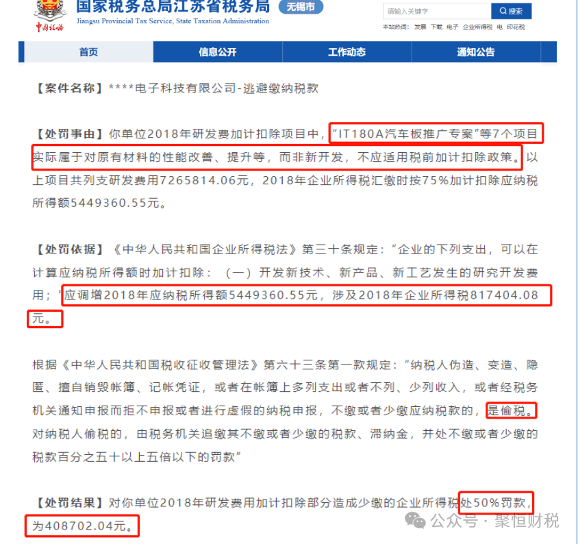 无锡一家电子科技公司因将“IT180A汽车板推广专案”等7个项目实际属于对原有材料的性能改善和提升,而非新开发活动,错误适用加计扣除政策,被税务机关认定为偷税,要求补税80多万元,并处以40.87万元的罚款。
