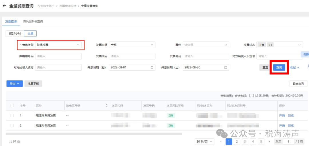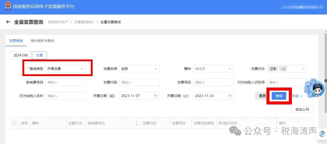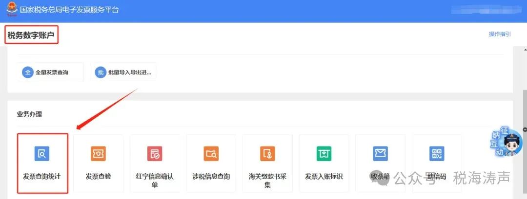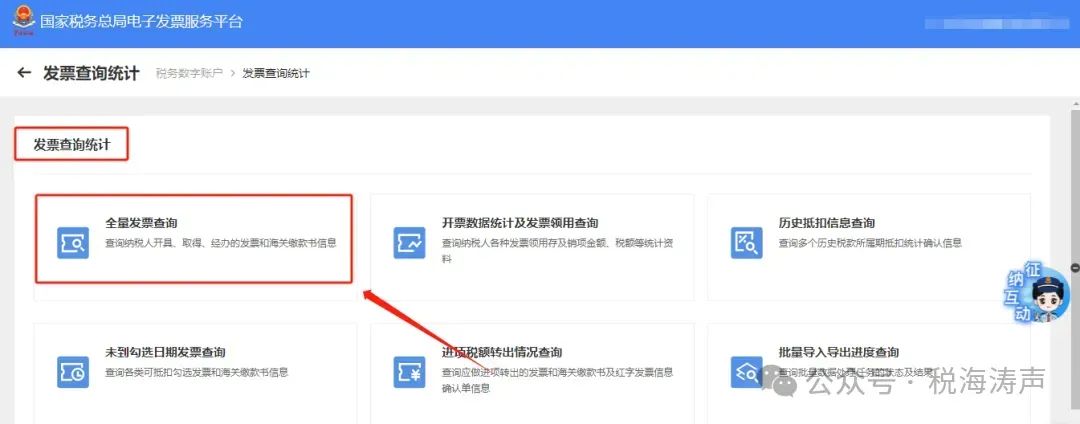 在电子发票服务平台依次点击【税务数字账户】-【发票查询统计】-【全量发票查询】进入发票查询页面——