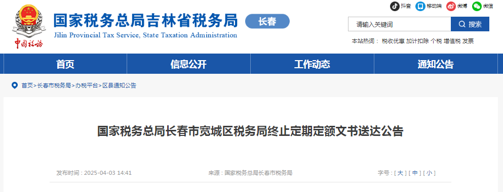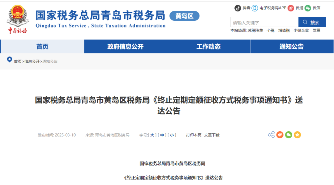 通知内容:自2025年1月1日起终止你户(单位)的定期定额征收方式。终止定期定额后,你户(单位)征收方式转为查账征收。请你户(单位)严格按照有关规定,及时、足额申报缴纳相关税款。