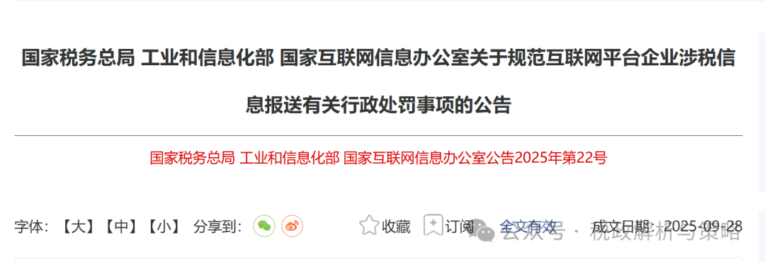 为落实《互联网平台企业涉税信息报送规定》(以下简称《规定》),国家税务总局、工业和信息化部、国家互联网信息办公室联合制发《关于规范互联网平台企业涉税信息报送有关行政处罚事项的公告》(2025年第22号)(以下简称《公告》)。现解读如下: